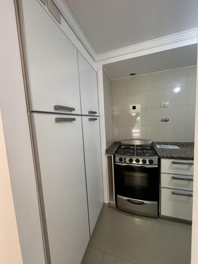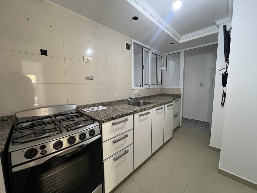 - Cocina con mobiliario bajo mesada, artefacto cocina Orbis a gas y mobiliario complementario de guardado