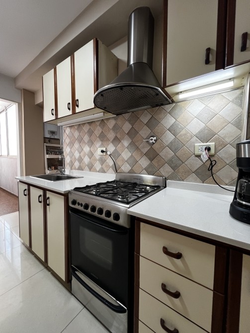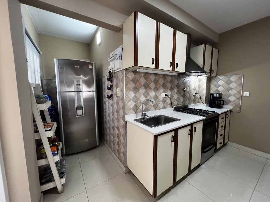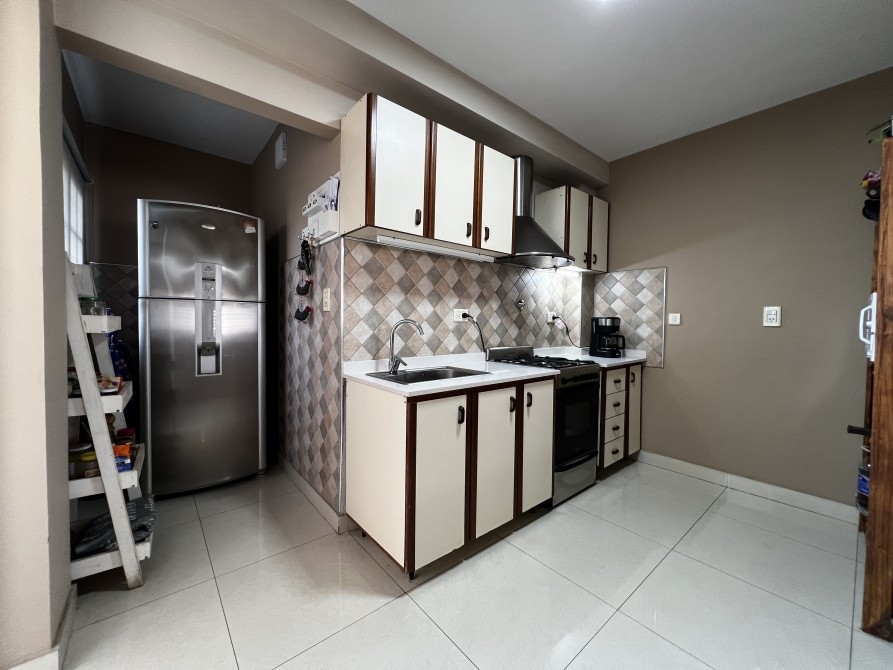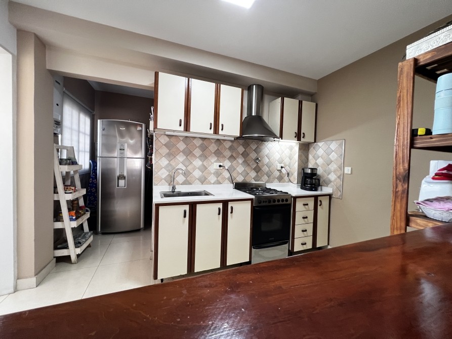 Cocina con barra desayunadora que ocnecta con el living lo que le da mayor amplitud al espacio; mobiliario bajo mesada y alacena; artefacto cocina a gas; espacio de baulera para guardado;
