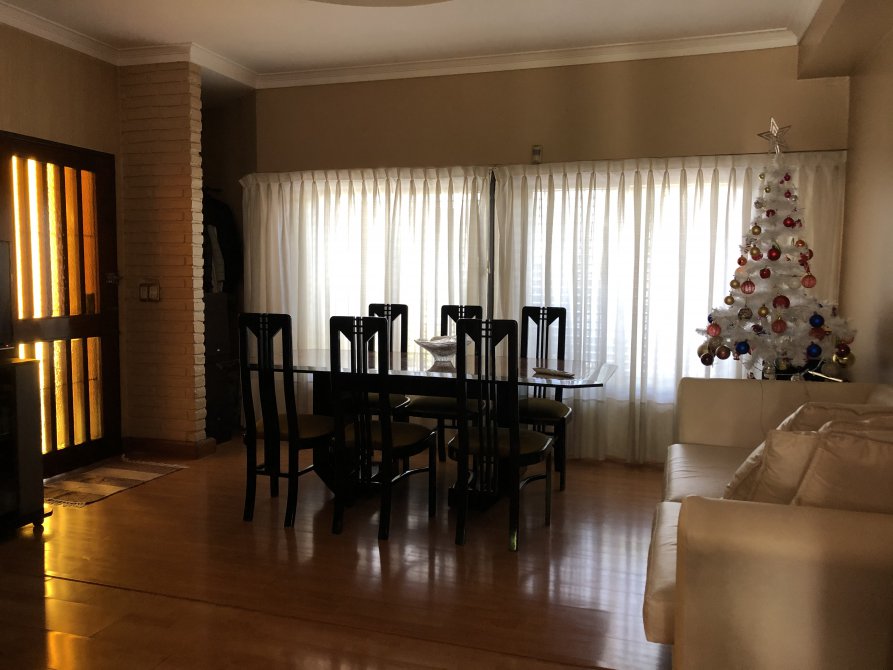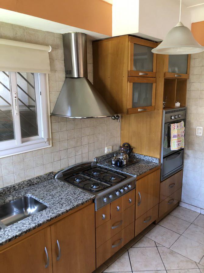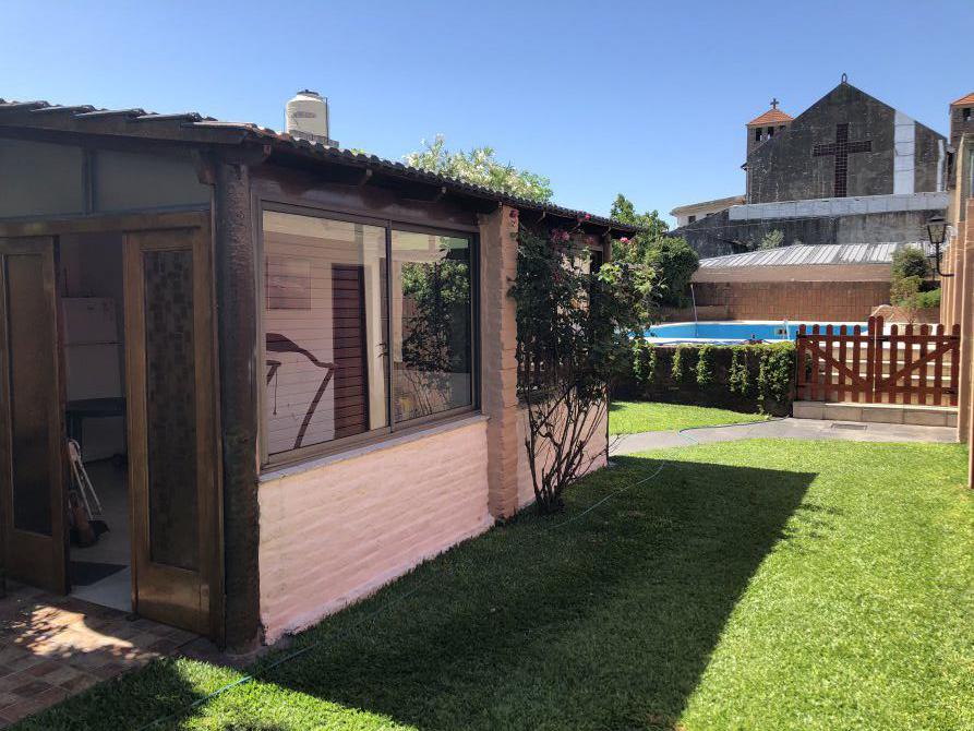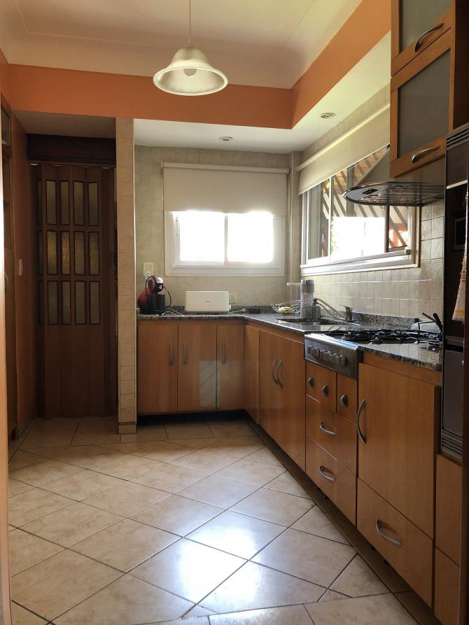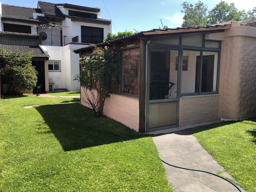 En planta baja: Jardín al frente de recepción y espacio para auto descubierto; garage cubierto para dos autos (total espacio para 3 autos); Cocina con muebles bajo mesada y alacena en madera, barra pasa platos que conecta la cocina con el comedor, la que también puede usarse como barra desayunadora; anafe y horno empotrado; desde el sector de cocina accedemos al lavadero de la propiedad. El comedor diario cuenta con gran ventanal al parque, como así también la cocina, la cual tiene ventilación natural y campana de acero inoxidable; pasando el comedor diario, y mirando al frente nos encontramos con un cómodo living con ventanal a la calle; toilette y pequeño escritorio. Saliendo del espacio cubierto de la casa; encontramos un fondo parquizado de aproximadamente 30 metros de largo, donde podemos disfrutar de una gran pileta de 10 x 4 metros; quincho preparado con parrilla y baño (de manera de que quien este usando la pileta pueda usar esos baños sin necesidad de ingresar a la casa). Todo el fondo de la propiedad, especialmente la pileta, tiene orientación norte lo cual le da sol prácticamente todo el día.