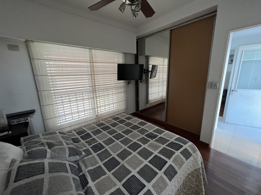 Todo el departamento tiene persianas de madera tipo barrio en los ventanales de los dormitorios como así también piso de madera hidro laqueado; en el living y cocina los pisos son de porcellanato.