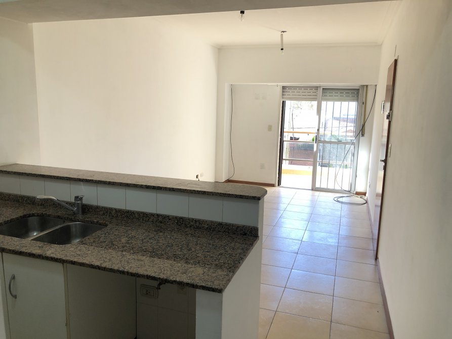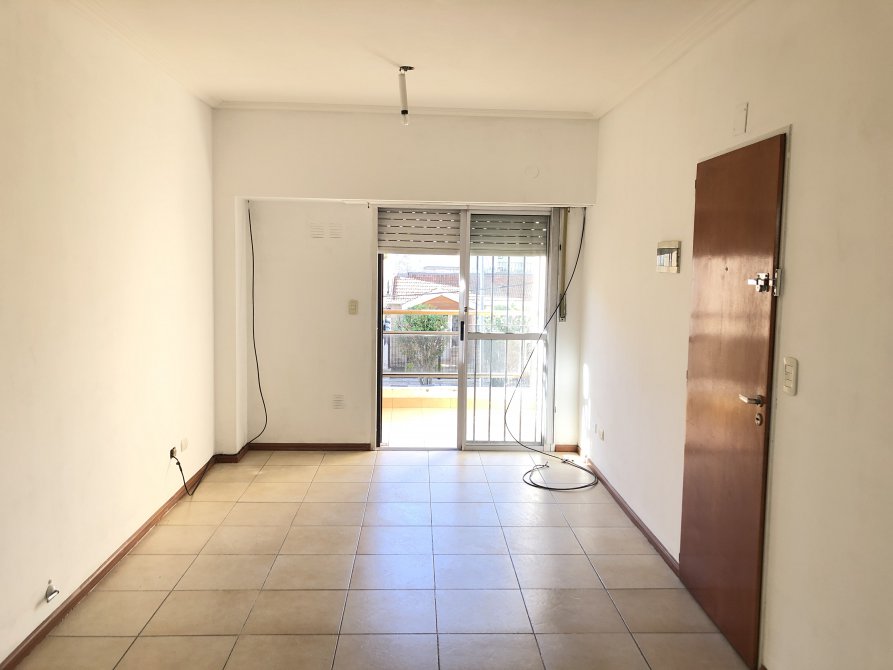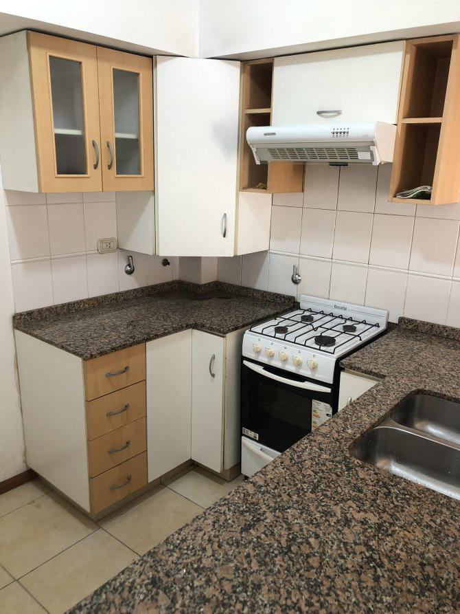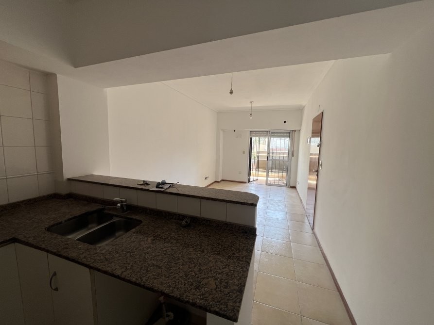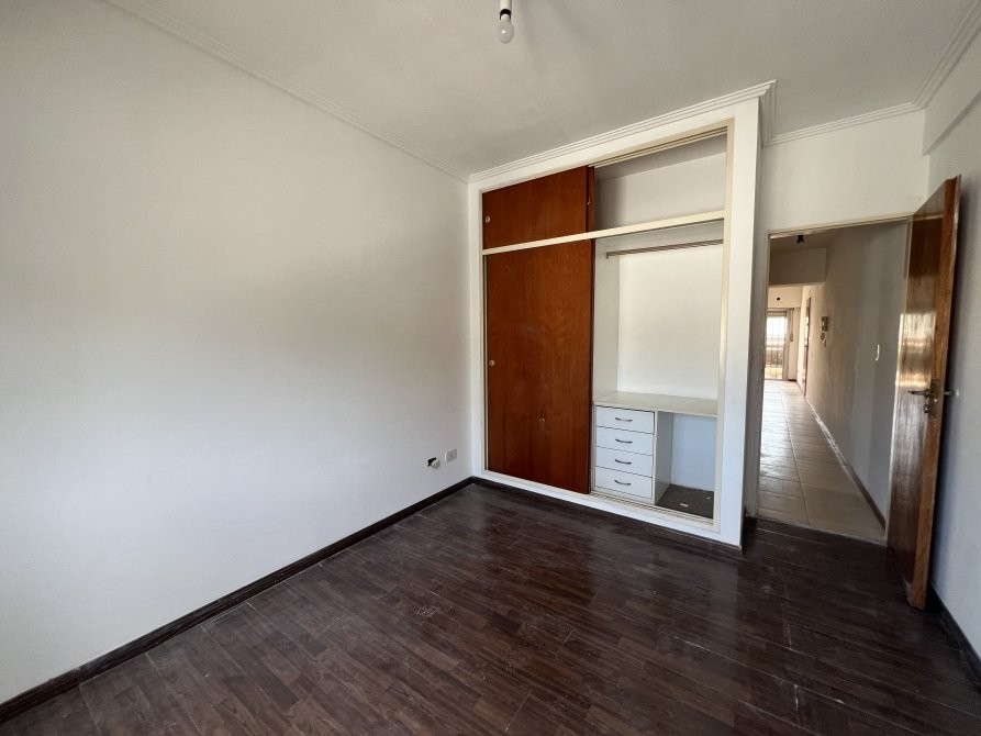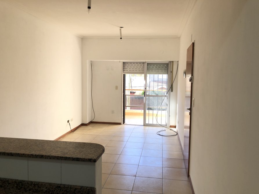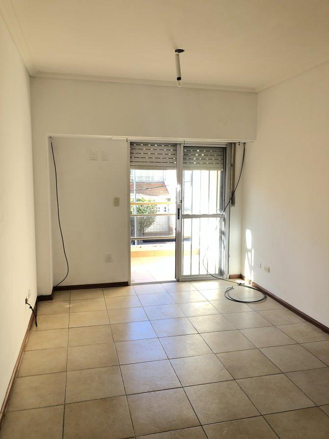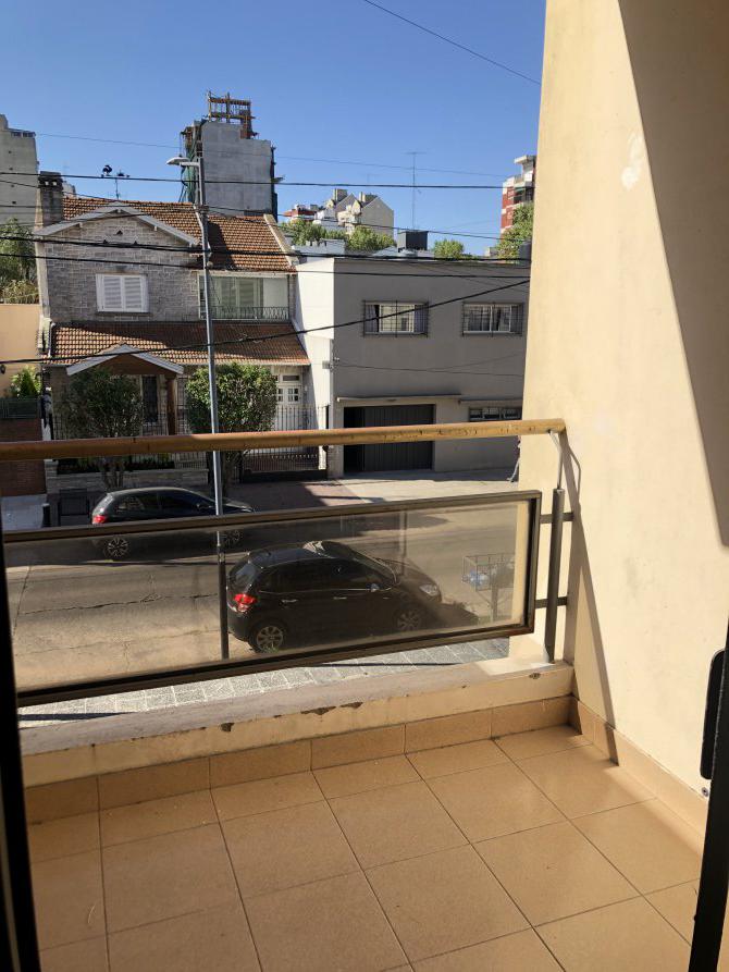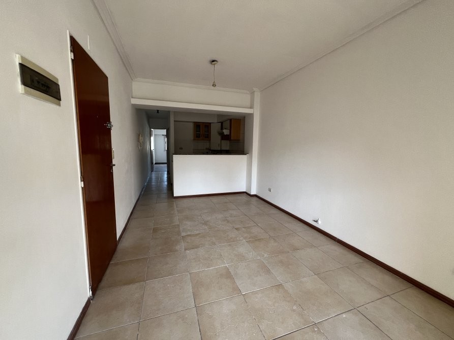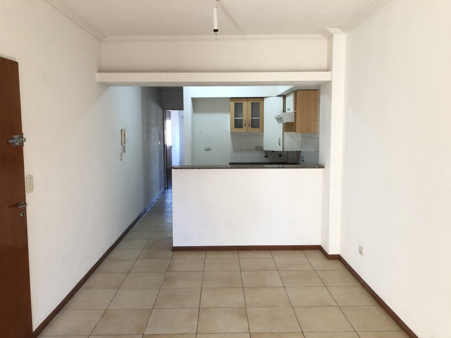 Departamento de dos ambientes en alquiler, al frente en primer piso, tipo pasante. Esta unidad, consta de living comedor al frente con acceso a balcón; cocina con muebles bajo mesada y alacena, con desayunador que conecta con el living; artefacto cocina a gas y spar; cómodo baño completo con bañera; placar de cortesía en pasillo; dormitorio con frentes e interiores de placard y piso flotante.