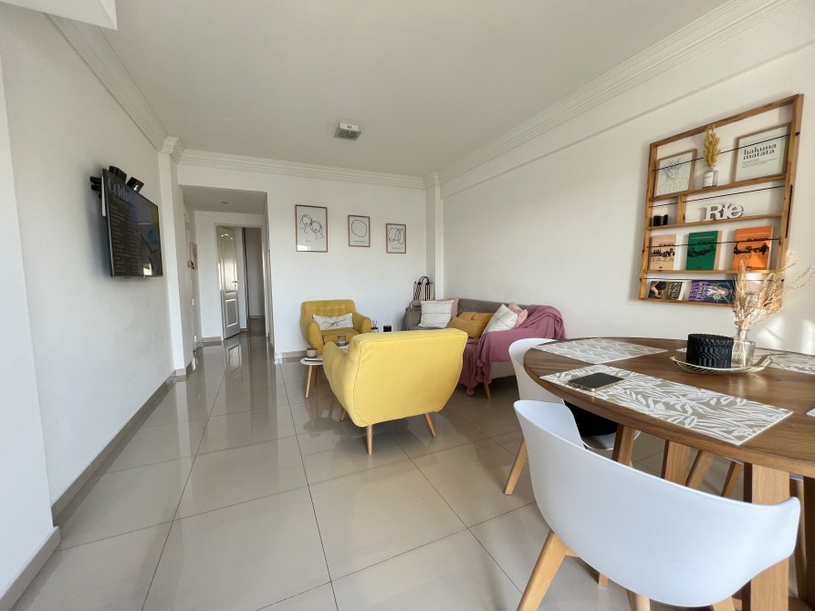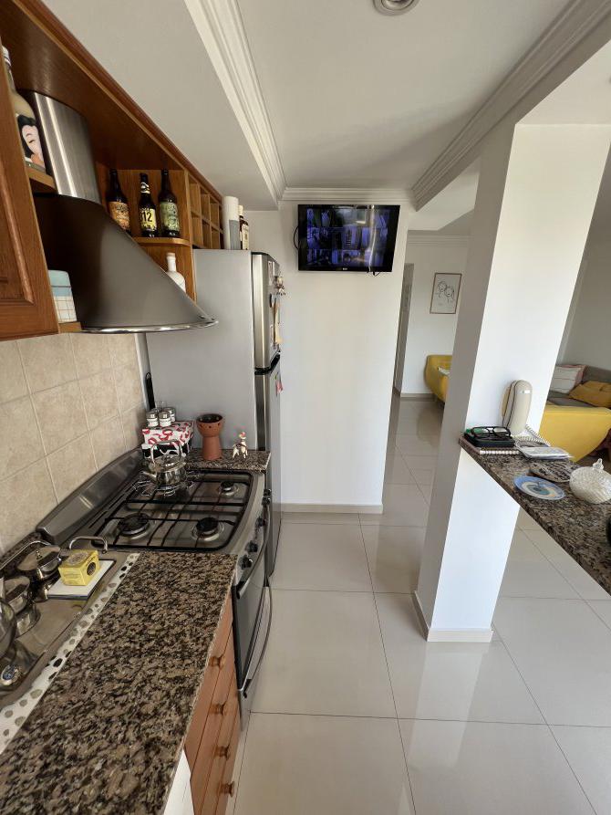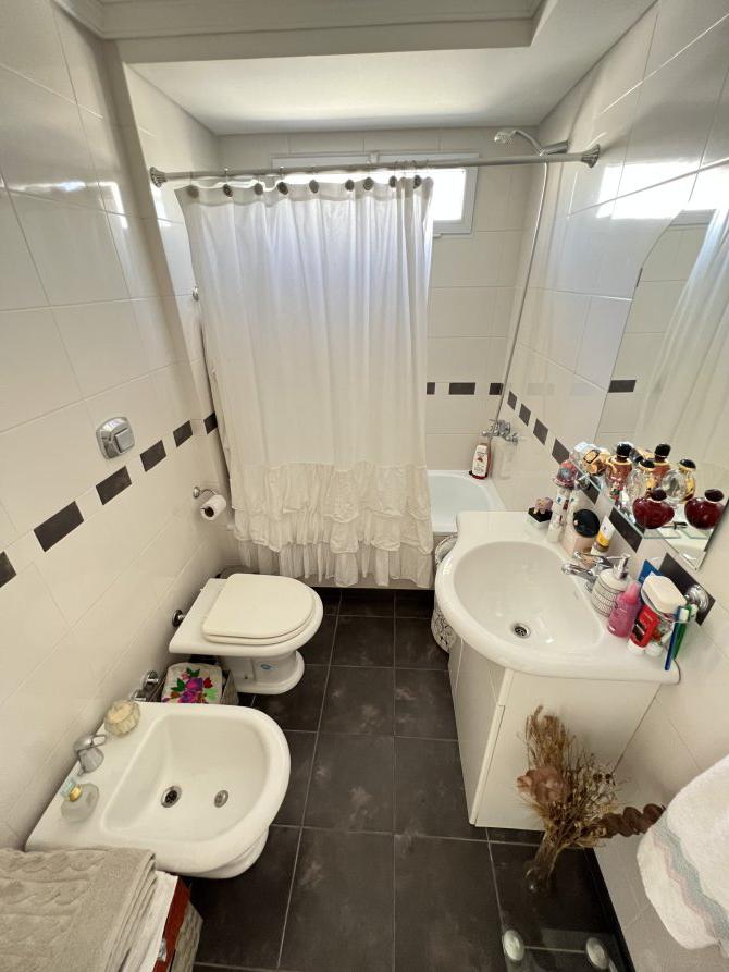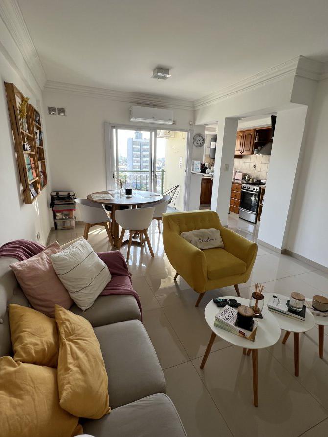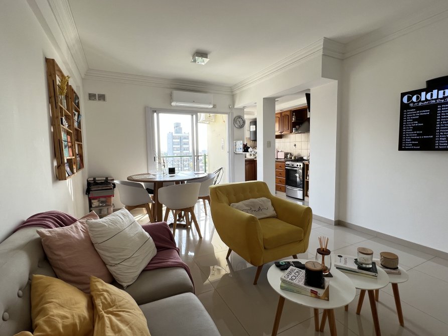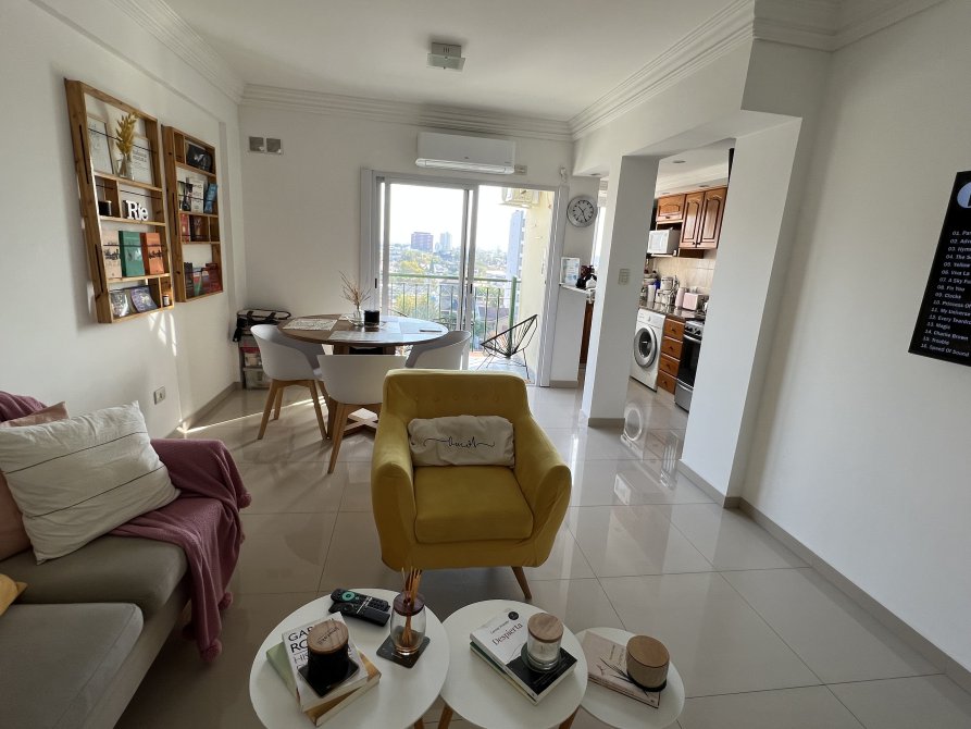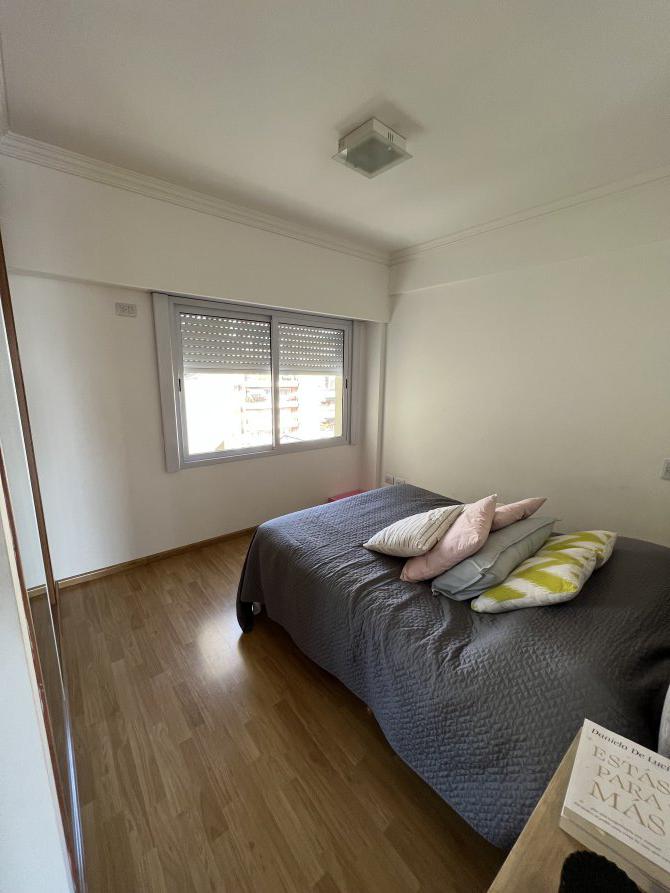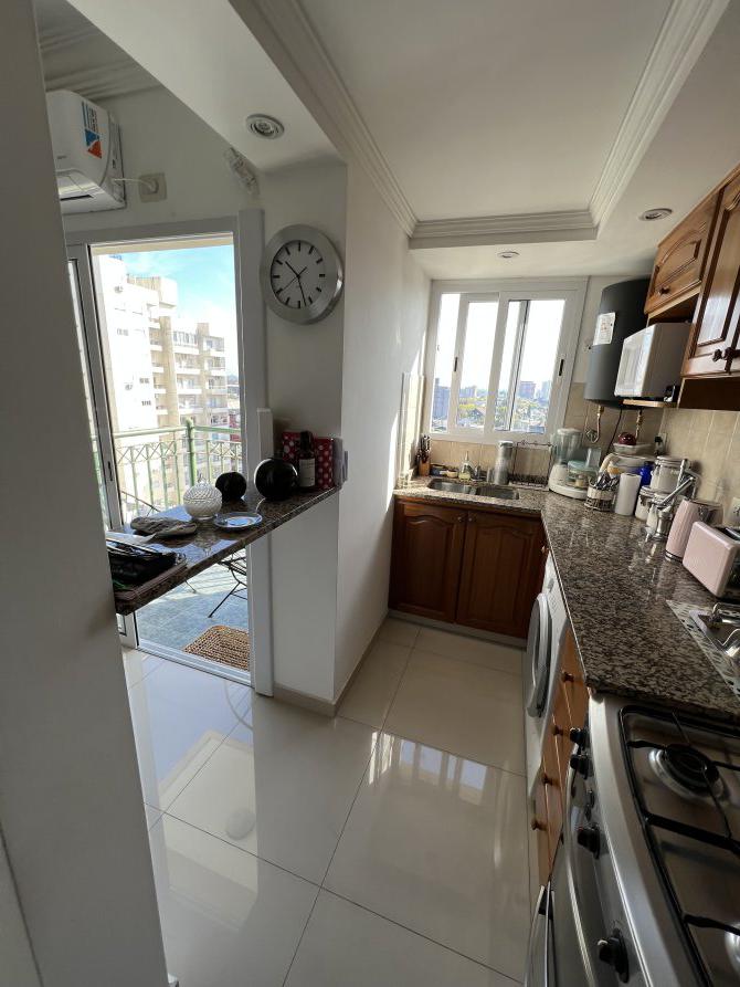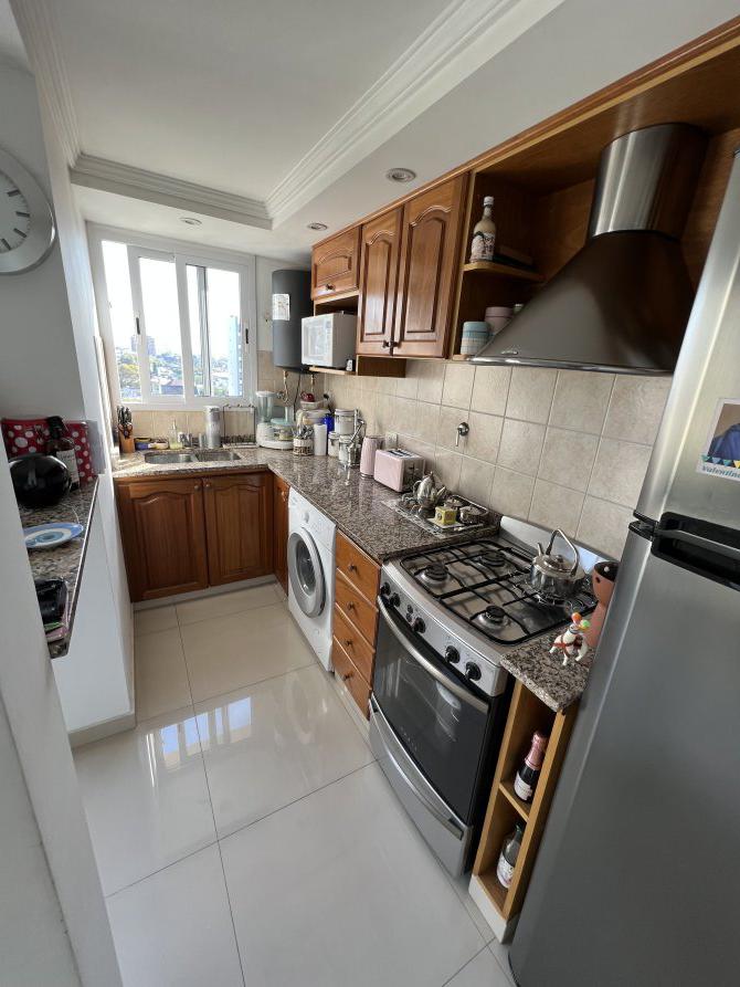 En venta, departamento de 2 ambientes, ubicado en un 7mo piso al contra frente, con orientación norte y excelentes visuales. Esta unidad, de 48m2 aprox., consta de living comedor con acceso a cómodo balcón; cocina semi integrada con desayunador, muebles bajo mesada y alacena con puertas en roble macizo, lavadero integrado, artefacto cocina marca Orbis, monitor TV de 24" para visualizar las 8 cámaras de seguridad del edificio, termo tanque eléctrico marca Ariston; 1 baño completo con artefactos Ferrum, griferia Fv y ventilación natural; dormitorio con frentes e interiores de placard y ventanal con persianas de PVC.