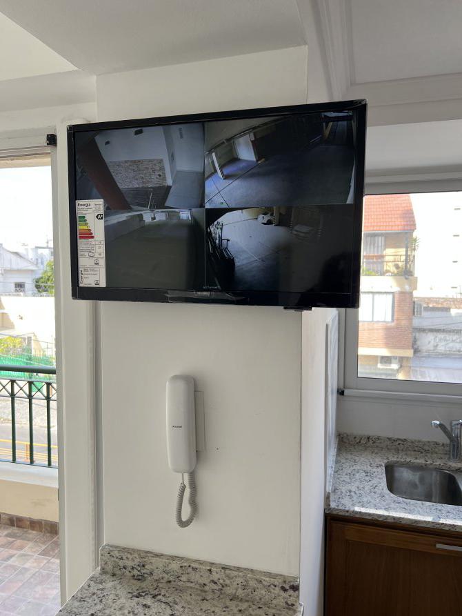CCTV con cámaras en áreas comunes y televisor de 24" instalado en cocina.